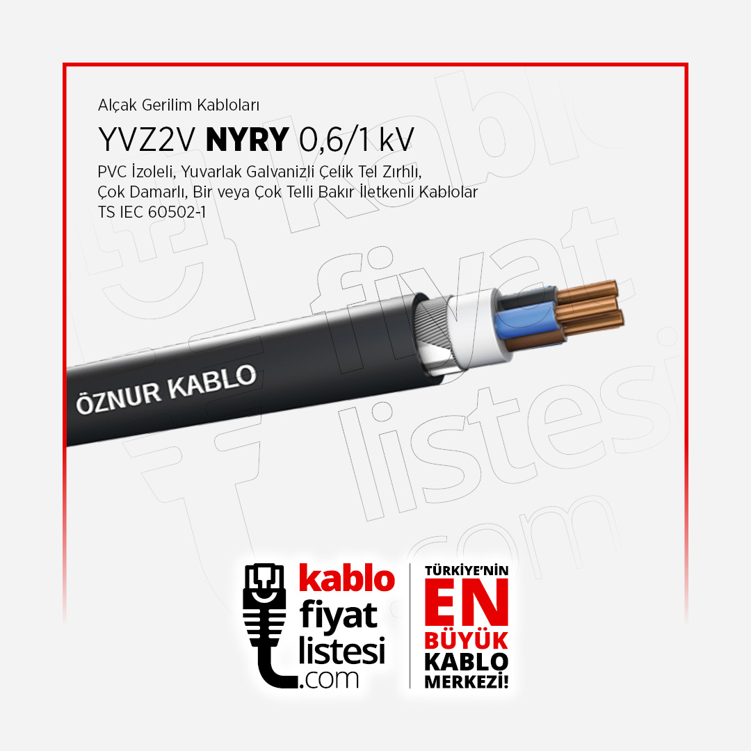 NYRY YVZ2V Alçak Gerilim Kablo, dayanıklı yapısı ve güvenilir performansıyla sanayi, ticaret ve altyapı projelerinde yaygın olarak kullanılır. Hem yeraltı hem de yerüstü elektrik tesisatlarında, enerji iletiminin güvenli bir şekilde gerçekleştirilmesine olanak tanır. Elektrik projelerinde uzun ömürlü ve dayanıklı bir çözüm arayanlar için idealdir.